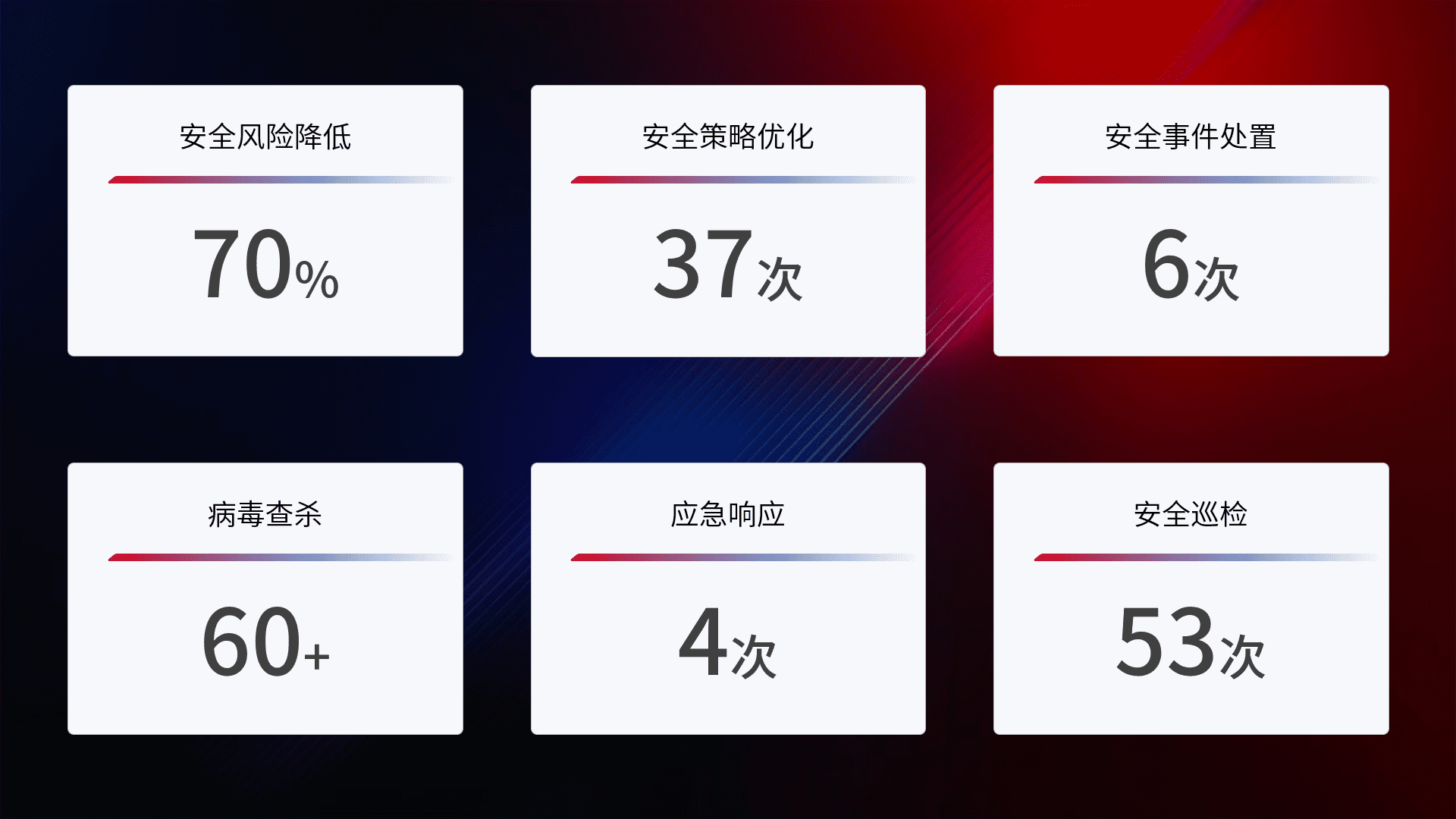 提供全面的安全事件报告体系,,包括处置报告、、周报、、季度和年度总结,,,结合持续监控,,,帮助客户深入了解网络安全状况。。。