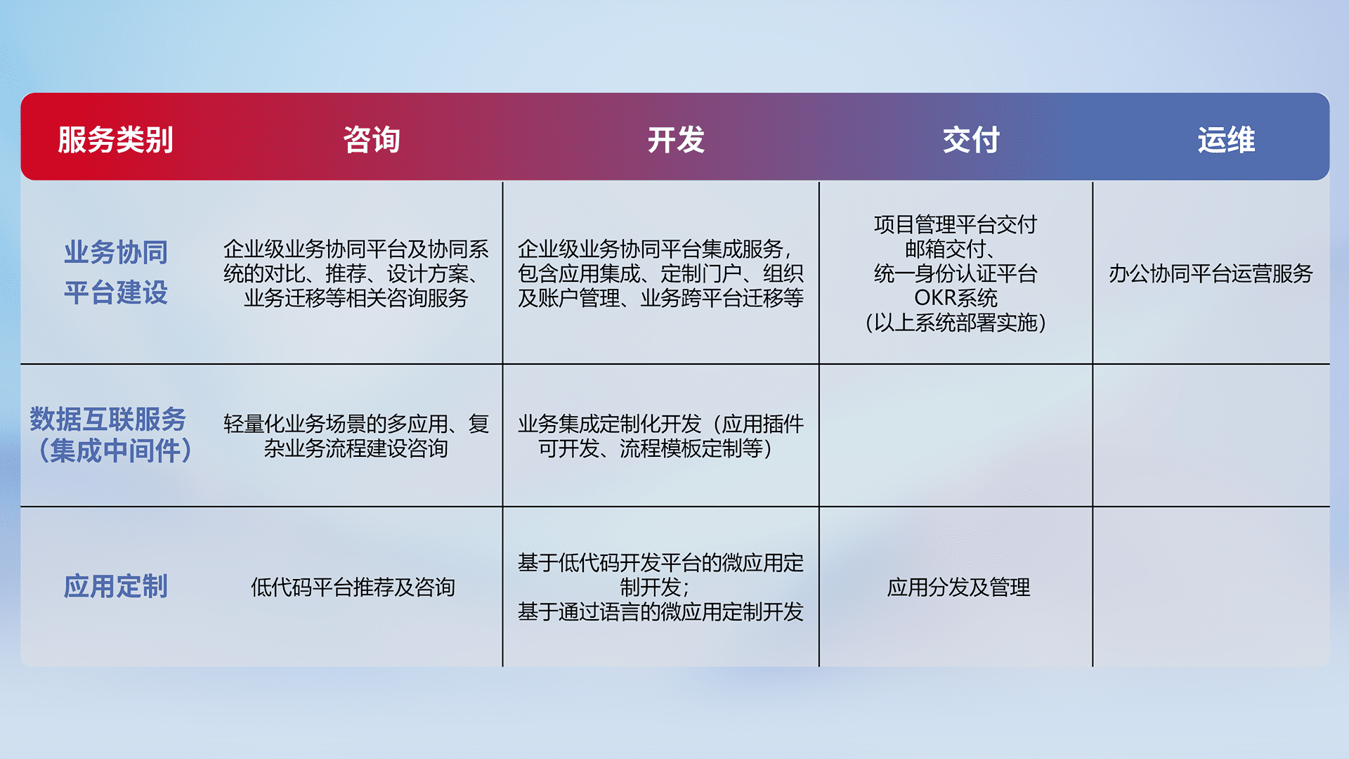 针对钉钉、、、、企微、、、IDaas等平台级产品提供产品的规划、、、方案、、、交付、、、、定制化开发等服务,,,,实现如统一协同办公、、、、智能客户服务、、混合会议管理、、、智能数据查询、、、等业务场景,,,,实现数字化转型。。。。